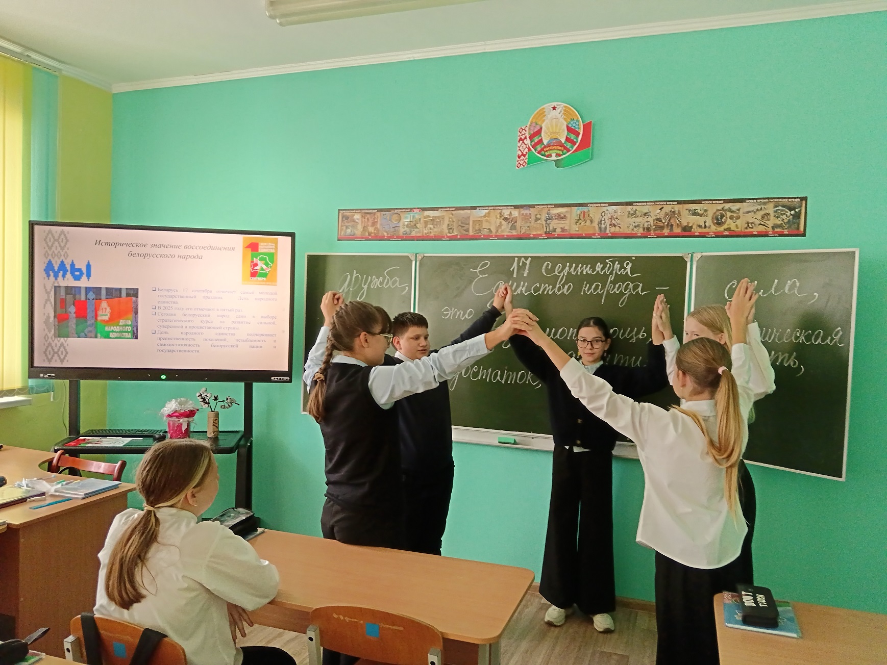 Сегодня в 7"Б" прошёл урок, посвященный Дню единства белорусского народа, государственному празднику Беларуси. Учащиеся нашего класса вспомнили историю этого праздника, те события, которые привели наш народ к осознанию ценности национального Единства и Независимости. Приятно осознавать, что ребята могли сами многое сказать, что они ориентируется в исторических событиях