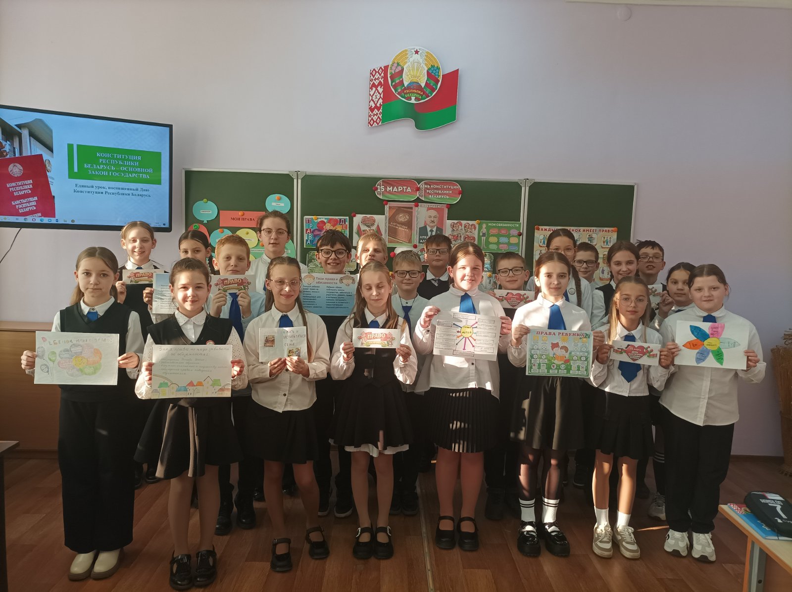 В преддверии государственного праздника, который отмечается 15 марта, в 4 «Б» классе прошёл Единый урок, посвящённый Дню Конституции Республики Беларусь. Цель занятия – формирование у учащихся уважения к Основному закону страны, активной гражданской позиции на основе понимания основных положений Конституции, готовности активно соблюдать законы своей страны. Ребята узнали об истории создания закона, разгадали кроссворд, вспомнили права и обязанности детей в нашей стране. Наша Конституция даёт возможность достойно жить, развиваться, чувствовать себя в безопасности, реализовать самые смелые планы и начинания на родной земле.