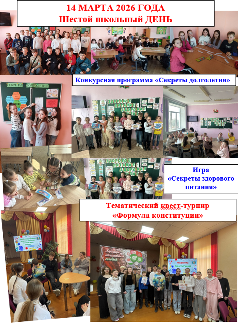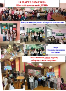 В рамках шестого школьного дня для учащихся 3-4 классов прошла конкурсная программа "Секреты долголетия"; для учащихся 1-2 классов игра " Секреты здорового питания"; для учащихся 7-8 классов тематический квест-турнир "Формула Конституции"