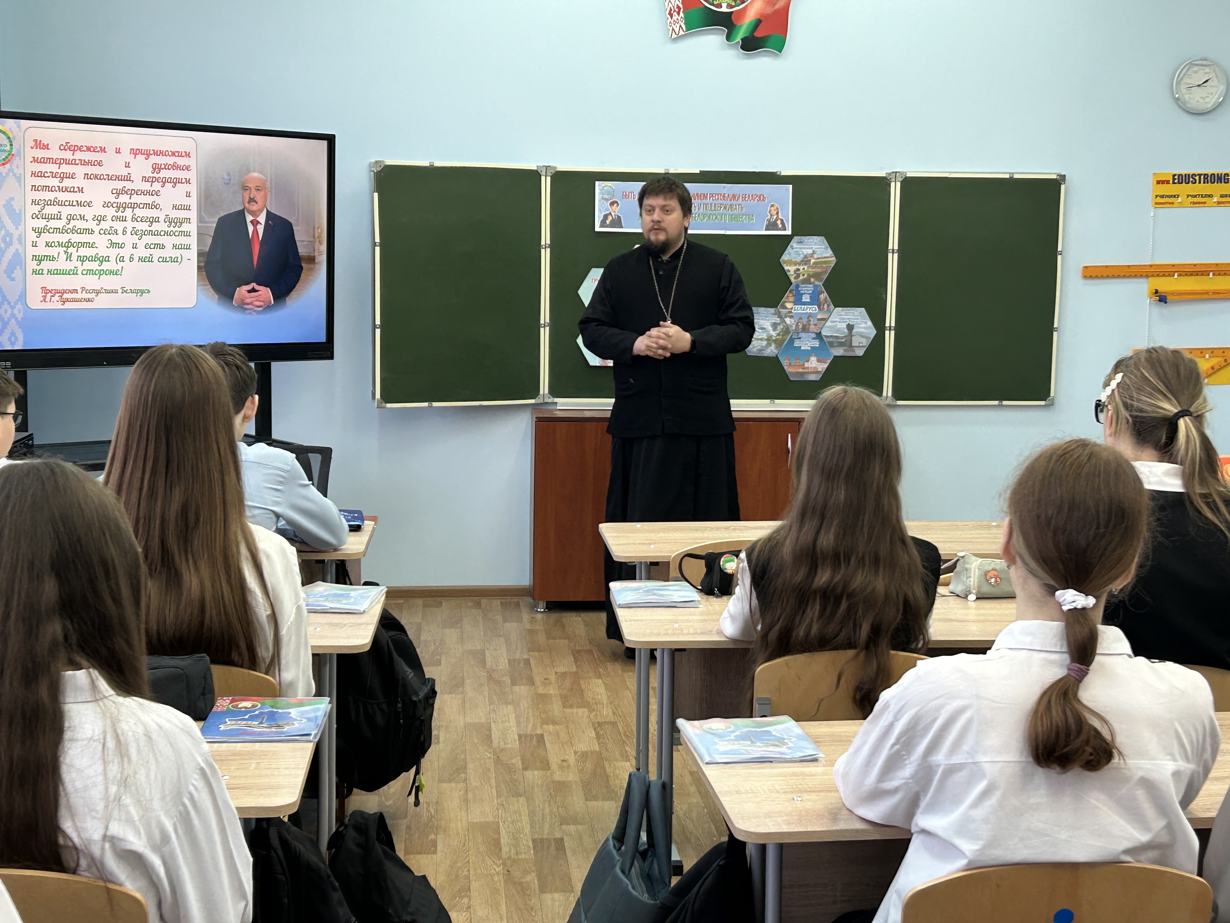 В рамках информационно-образовательного проекта «Школа Активного Гражданина» в 8 «Б» классе прошёл классный час на тему «Быть достойным гражданином Республики Беларусь - значит разделять и поддерживать духовные ценности белорусского общества». В качестве гостя был приглашён священник Иоанн, который рассказал о важнейших ценностях любого государства - миролюбии и веротерпимости. Учащиеся рассуждали о том, как духовные ценности проявляются в реальной жизни и о том, какое отношение имеют к каждому из нас.