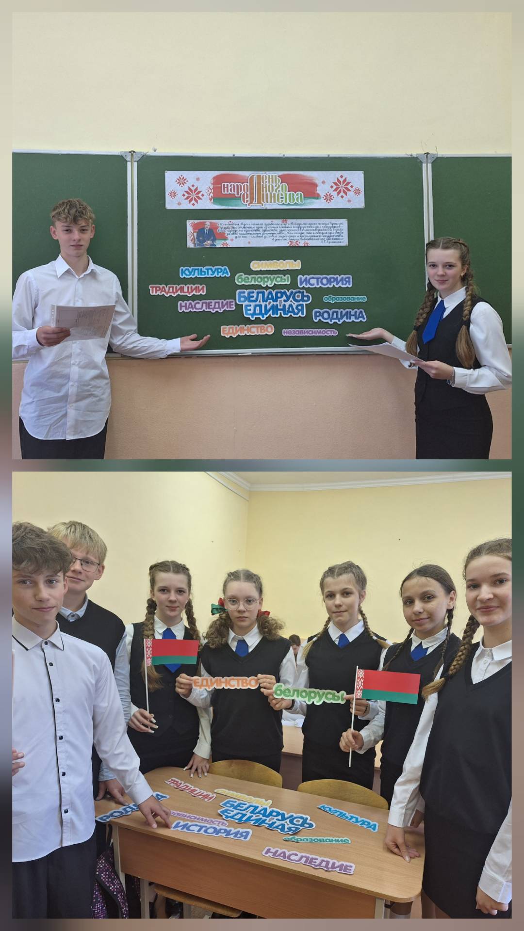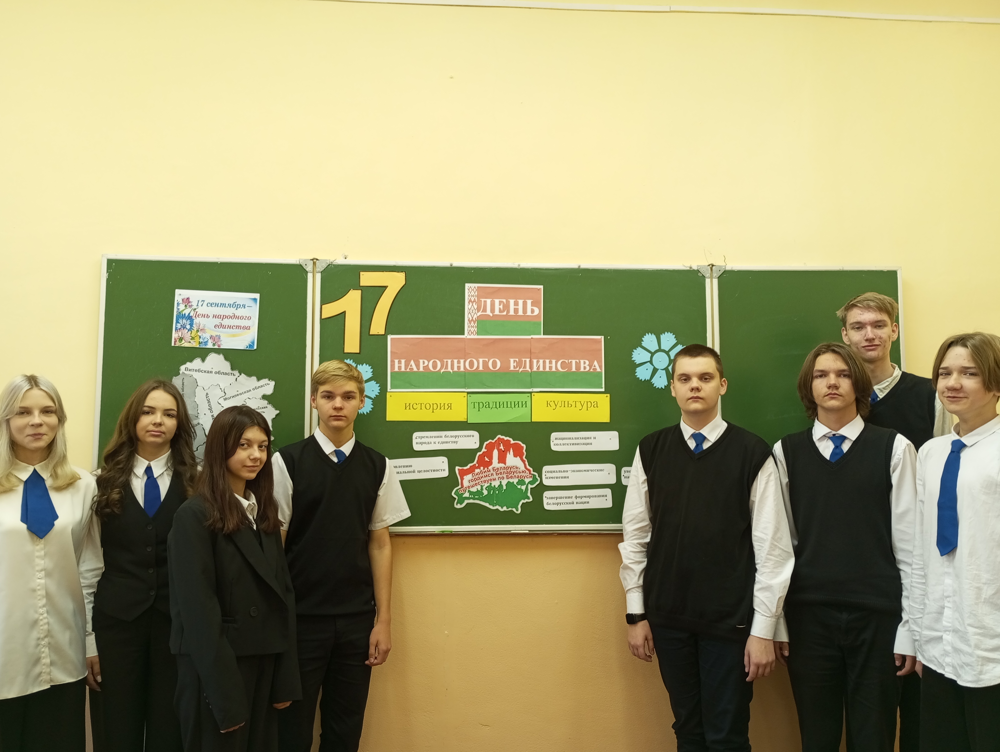 17 сентября в 9 Б классе прошёл урок, посвященный Дню народного единства. Ребята размышляли о сути народного единства, о том, что может объединить народ, значении даты 17 сентября 1939г. для белорусского народа