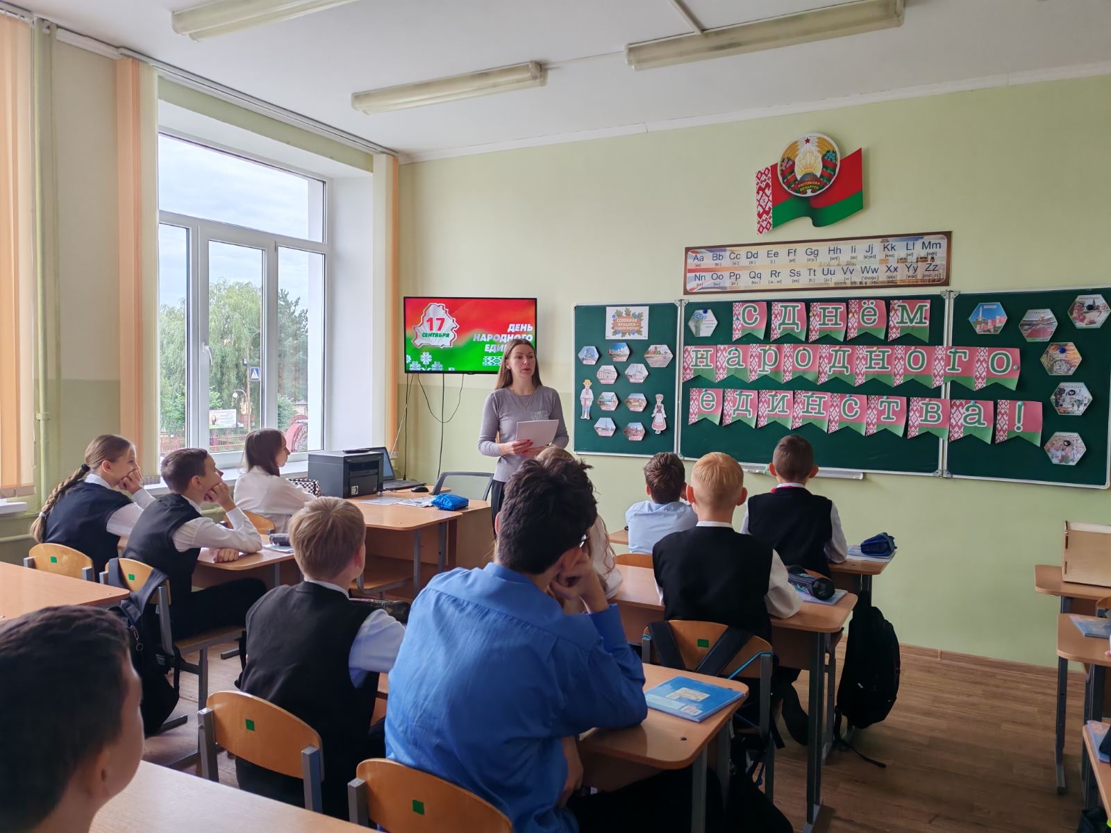 17 сентября для учащихся 7 «В» класса прошёл Единый урок, посвященный Дню народного единства, главной целью которого являлось формирование чувства почитания и уважения к традициям своего народа, желания любить и оберегать свою страну, быть патриотами Республики Беларусь