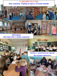 В рамках шестого школьного дня 13 декабря в нашей школе прошел День здоровья. Турнир по дартсу "Самый меткий" для 5-11 классов; для учащихся 1-4 классов прошла викторина "Путешествие в страну здоровья"; для учащихся 9-х классов прошло занятие с элементами арт-терапии "Без вредных привычек"