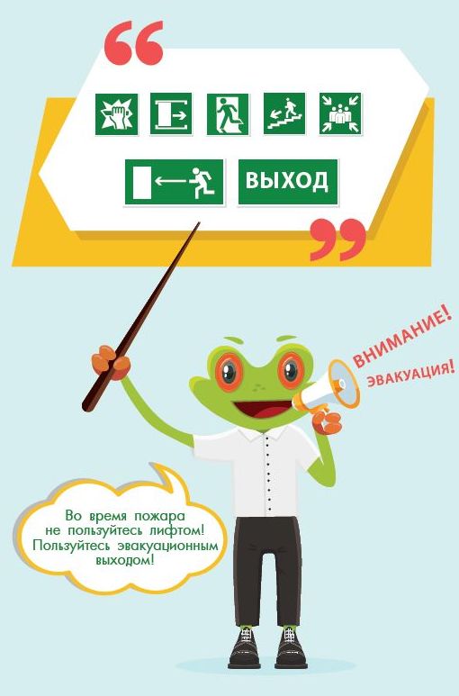 Эвакуационные знаки. Эти яркие обозначения на стенах, полах, потолке – ваш путеводитель по маршрутам эвакуации.  Они помогут вам найти кратчайший путь к выходу в случае чрезвычайной ситуации. Изучайте их!